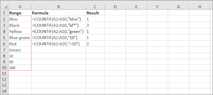 When the criterion is entered in the form of a cell reference, no double quotes are used. In the COUNTIF default setting, cell contents must be an exact match to be counted. Wildcard characters (*, ?, ~) are supported for partial matches. COUNTIF is not case-sensitive. |