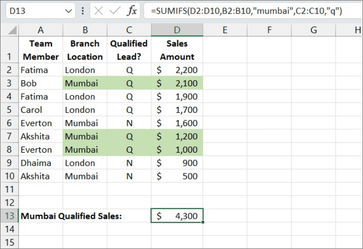 | What it does | Finds the sum of cells within a range that meet all the stated criteria. |
