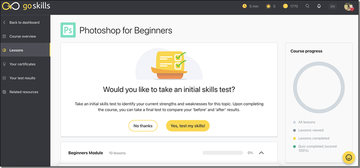 GoSkills courses give learners the option of taking a placement test before commencing a course. This sorts the course lessons into areas of strength, weakness, and refresher so that you can easily see exactly how much an employee already knows about a given topic.