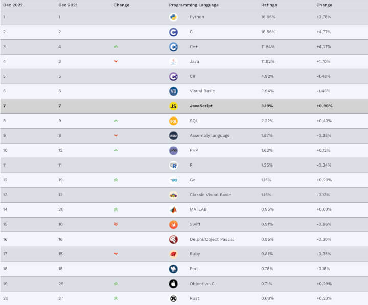 The other language that's generally associated with data science is R. However, according to the TIOBE Index mentioned above, R’s popularity is dropping and has even fallen out of the TIOBE Top 20 list this year, after having been in the Top 20 for 3 years. So if you're deciding between the two, trends are suggesting Python is the more robust choice.