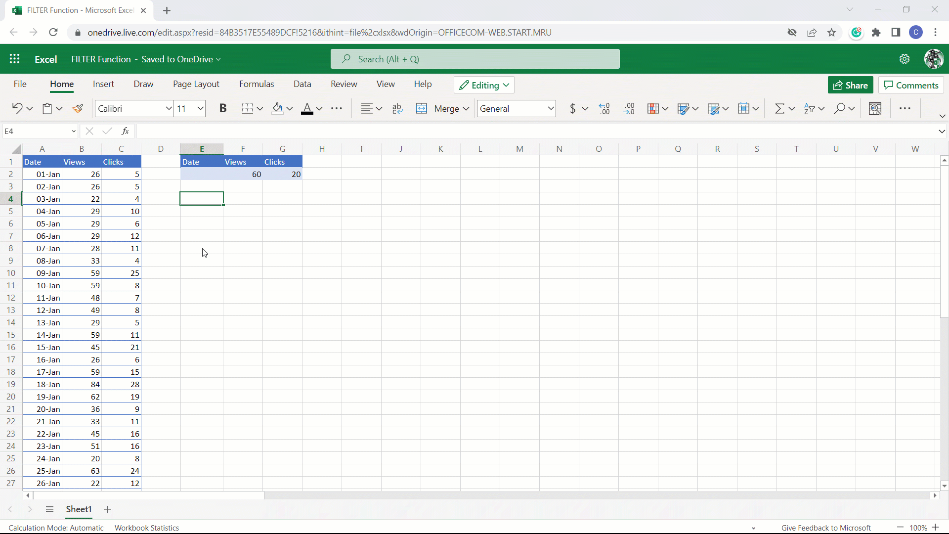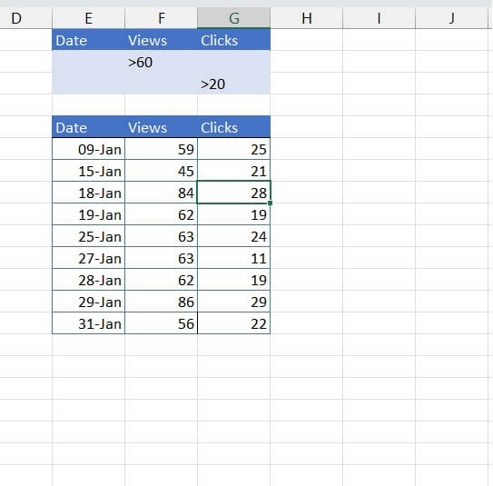 To illustrate: the dataset below shows the number of views and clicks on a website by date. If we wanted to isolate dates that had more than 60 views or which had more than 20 clicks, we can see that some dates had one but not the other (for example, January 19, 27, and 28 each had more than 60 views but fewer than 20 clicks. On January 9 there were more than 20 clicks but fewer than 60 views).